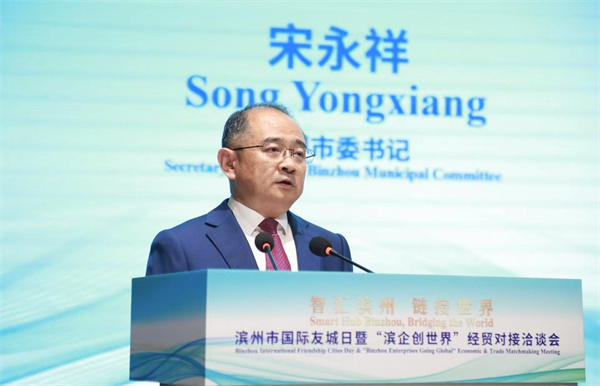 宋永祥在致辞中说,近年来,滨州在对外交流合作中积极搭建文明对话之门、搭建青年交流之桥、搭建城市展示之窗。深化与全球产业链、供应链、创新链合作,推动交通“畅达全球”、企业“勇闯世界”、城市“走向国际”。树牢“让企业和企业家舒服”的理念,着力营造市场化、法治化、国际化的一流营商环境。滨州愿与各国际友城、商会协会和各国友人一道,携手搭建友好交往的友谊新桥梁,加快构建互学互鉴的人文共同体。携手构建合作共赢的开放新格局,加快打造互利互惠的发展共同体。携手营造彼此成就的服务新环境,加快构建互尊互信的服务共同体。