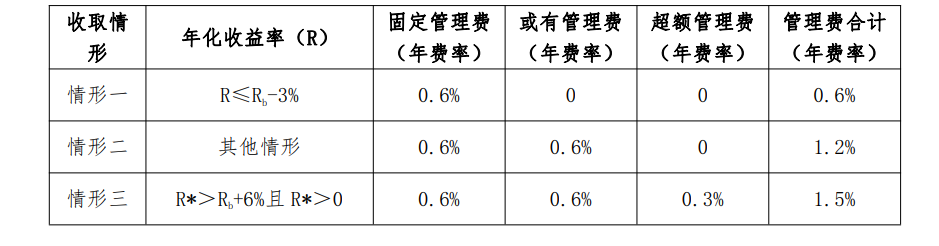 低档:当基金的年化收益率低于等于基准3%时,基金收取0.6%的固定管理费率。